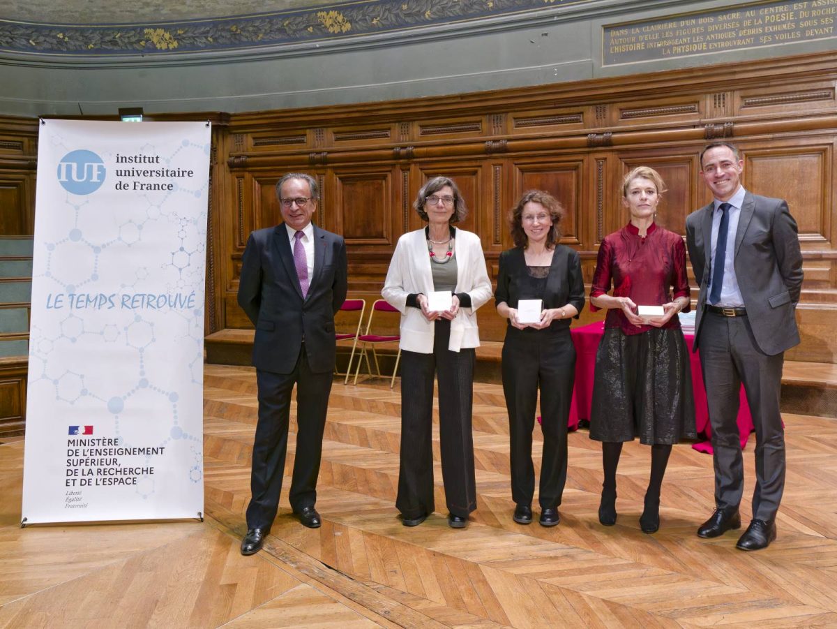 crédit : Yannick Boschat. Les lauréates de l’université de Caen en 2025 (dans l’ordre de gauche à droite : Francesca Gulminelli, Maud Pouradier et Juliette Thariat, entourées de Elyès Jouini (administrateur de l’IUF) et Christophe Rochais (vice-président à la recherche))